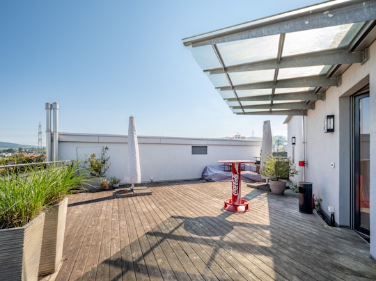 Die Etagen sind bequem über Lift und Treppenhaus erschlossen. Pro Geschoss stehen gemeinschaftlich genutzte WC-Anlagen zur Verfügung. Die teilweise gedeckte Dachterrasse im 5. Obergeschoss bietet allen Mietern einen attraktiven Rückzugs- und Begegnungsort mit herrlicher Aussicht.